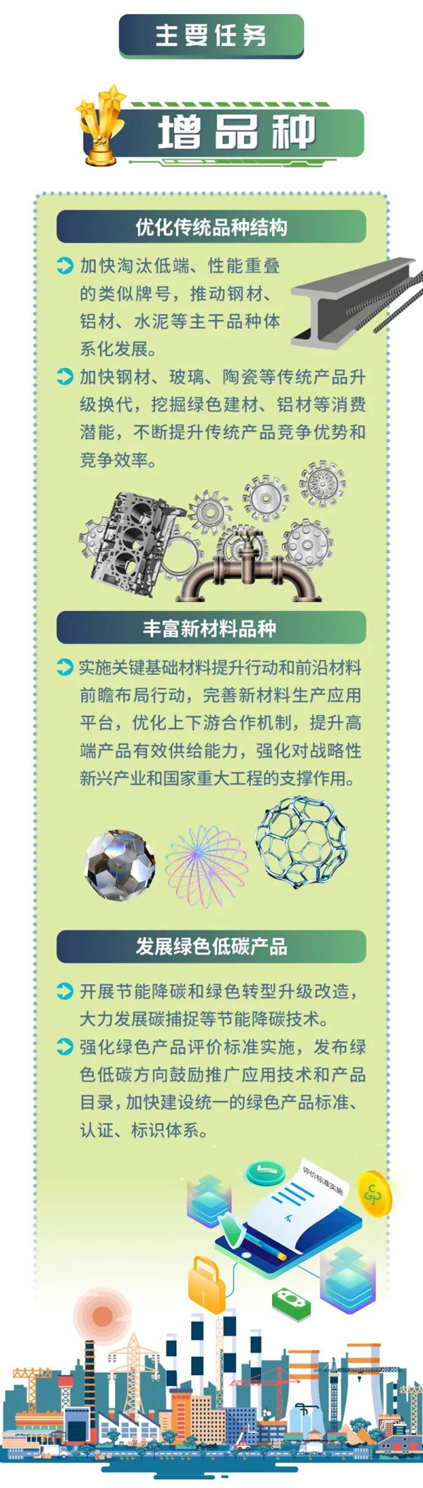 增品種——圍繞建材等行業(yè),開(kāi)展節(jié)能降碳和綠色轉(zhuǎn)型升級(jí)改造,逐步降低原材料產(chǎn)品單位能耗和碳排放量。
