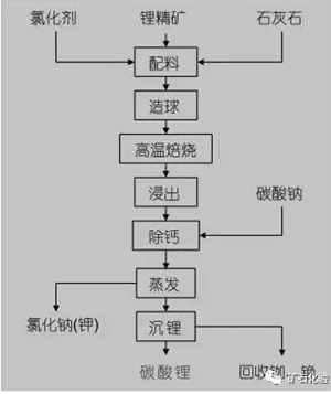 氯化焙燒法主要是采用氯化劑(氯化鈣)使鋰礦石中的鋰及其他有價(jià)金屬轉(zhuǎn)化為氯化物,分為中溫氯化和高溫氯化兩種工藝。