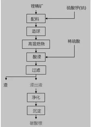硫酸鹽法常用于處理硅酸鹽礦物,但用于鋰礦石提取鋰時(shí),需要經(jīng)過鋰礦石與硫酸鉀(鈉)混合配料、造球、高溫焙燒,將礦石中的鋰置換成可溶性的硫酸鋰,經(jīng)稀硫酸浸出,浸出液經(jīng)凈化、沉淀獲得碳酸鋰。