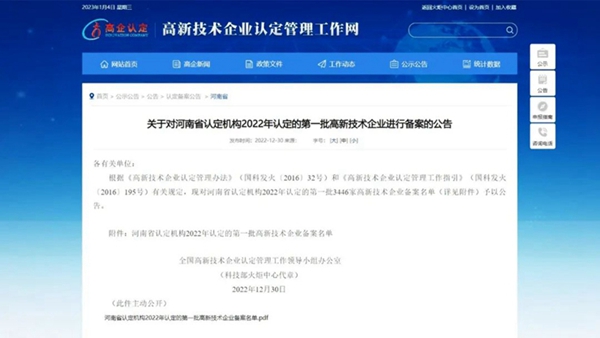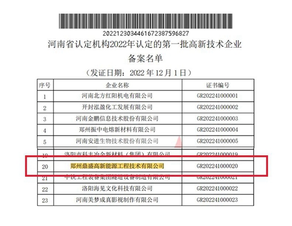 2022年12月30日,全國高新技術(shù)企業(yè)認(rèn)定管理工作領(lǐng)導(dǎo)小組辦公室,公布了《河南省認(rèn)定機(jī)構(gòu)2022年認(rèn)定的第一批高新技術(shù)企業(yè)備案公告名單》。鄭州鼎盛高新能源工程技術(shù)有限公司(以下簡(jiǎn)稱“鄭州鼎盛”)名列其中,順利通過“國家高新技術(shù)企業(yè)”復(fù)審認(rèn)定。