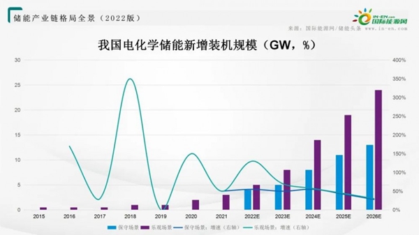 根據(jù)國(guó)家發(fā)展改革委、國(guó)家能源局發(fā)布的《關(guān)于加快推動(dòng)新型儲(chǔ)能發(fā)展的指導(dǎo)意見(jiàn)》規(guī)劃,2025年我國(guó)將實(shí)現(xiàn)新型儲(chǔ)能裝機(jī)規(guī)模 30GW 以上,據(jù) CNESA 保守估測(cè),2026年我國(guó)新型儲(chǔ)能裝機(jī)累計(jì)規(guī)模將達(dá)到48.5GW,對(duì)應(yīng)2022-2026CAGR為 53.5%。