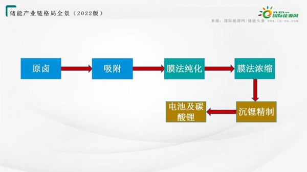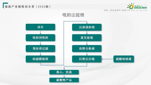 通過(guò)對(duì)鋰有選擇性的吸附劑吸附鹵水中的鋰,再用淡水解吸與其他雜質(zhì)分離并富集,再通過(guò)小型鹽田濃縮后化學(xué)沉淀鋰。