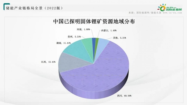 礦石鋰資源分布于四川、江西、湖南、新疆等省份,存儲(chǔ)量約為全國(guó)鋰資源存儲(chǔ)量的20%左右,其中四川省的儲(chǔ)量較大,占全國(guó)礦石鋰資源儲(chǔ)量的60%左右。