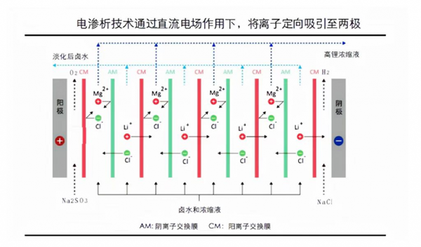 在外加直流電場(chǎng)的作用下,固態(tài)或液態(tài)離子交換膜對(duì)水中離子具有選擇性,使水中的一部分離子透過(guò)交換膜轉(zhuǎn)移到另一部分水中,從而達(dá)到分離鎂、濃縮鋰的目的。其優(yōu)勢(shì)在于可處理高鎂鋰比鹽湖、效率高;難點(diǎn)在于開(kāi)發(fā)具有優(yōu)選擇性、高鋰容量和高穩(wěn)定性的鋰捕獲材料。