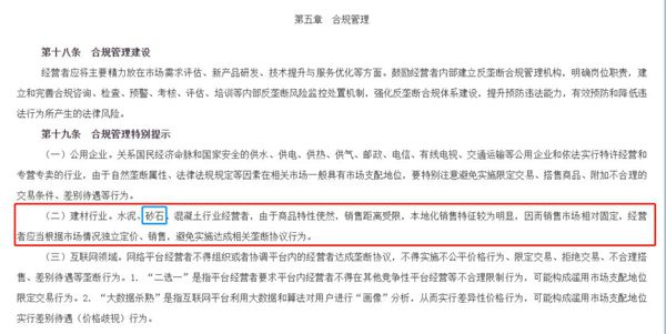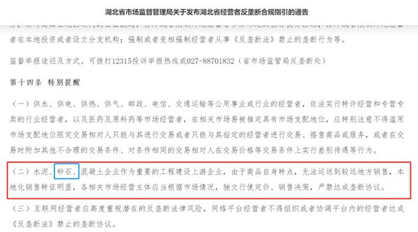 其中陜西、湖北、湖南等地發(fā)布的《經(jīng)營者反壟斷合規(guī)指引》中明確指出:水泥、砂石、混凝土行業(yè)經(jīng)營者,由于商品特性使然,銷售距離受限,本地化銷售特征較為明顯,因而銷售市場相對固定,經(jīng)營者應(yīng)當(dāng)根據(jù)市場情況獨立定價、銷售,避免實施達(dá)成相關(guān)壟斷協(xié)議行為。