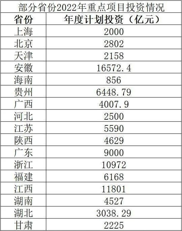 截至目前,全國已有19個省市區(qū)公布了2022年重點項目投資計劃清單,包括北京、上海、天津、廣東、江蘇、浙江、四川、貴州、河北、安徽等。其中,安徽、江西、浙江三省年度計劃投資均超萬億元。