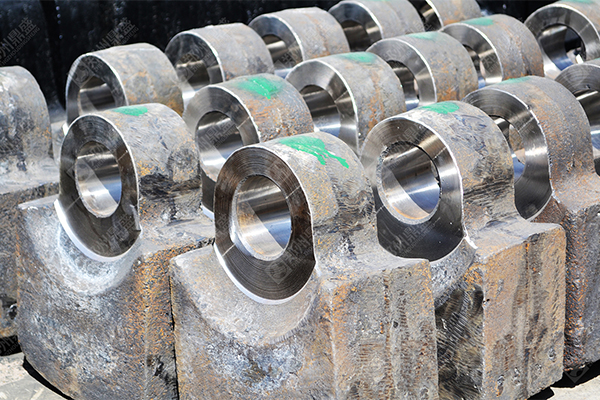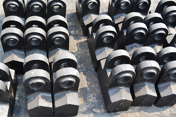 入料粒度在400mm以上的大型破碎機,錘頭材質建議選用具有高韌性的高錳鋼材質,錘頭重量建議選用單重在50千克以上的大錘頭;